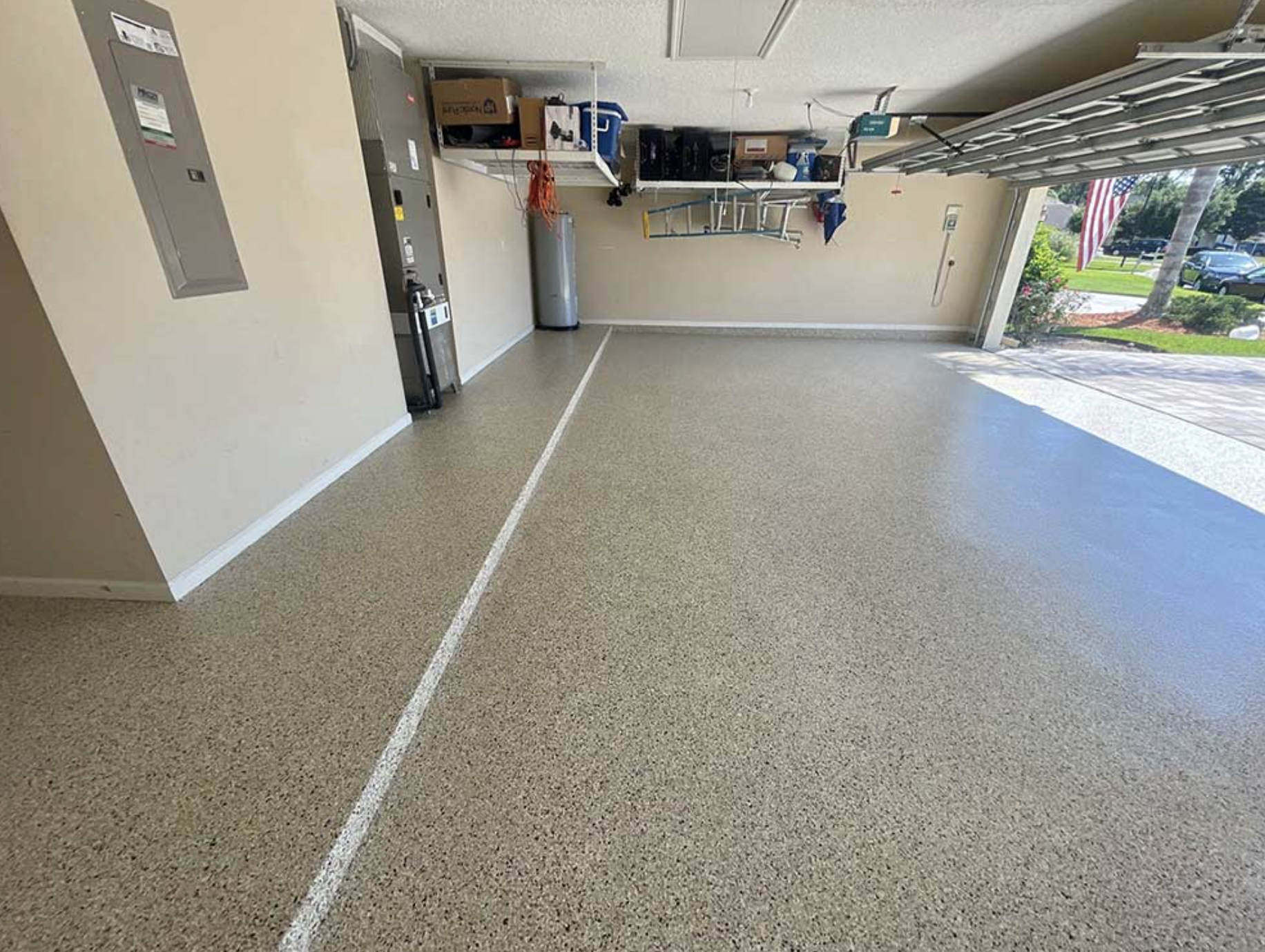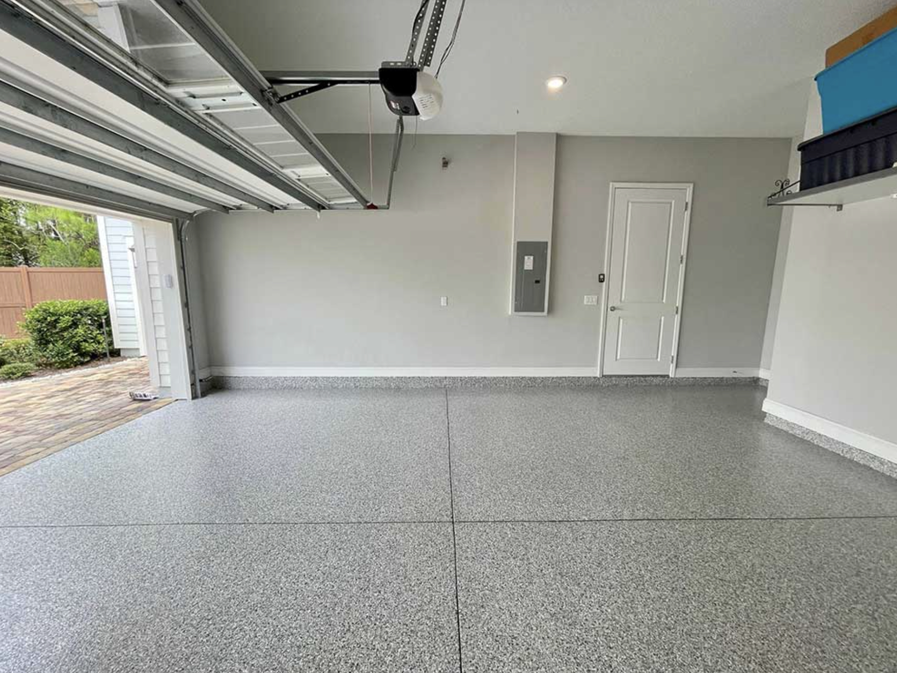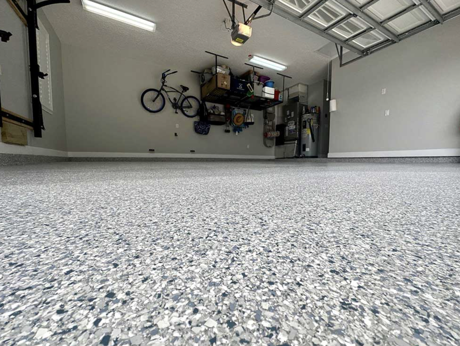 A three layer system consisting of either an epoxy or polyaspartic base, flakes and polyaspartic top-coat are applied.