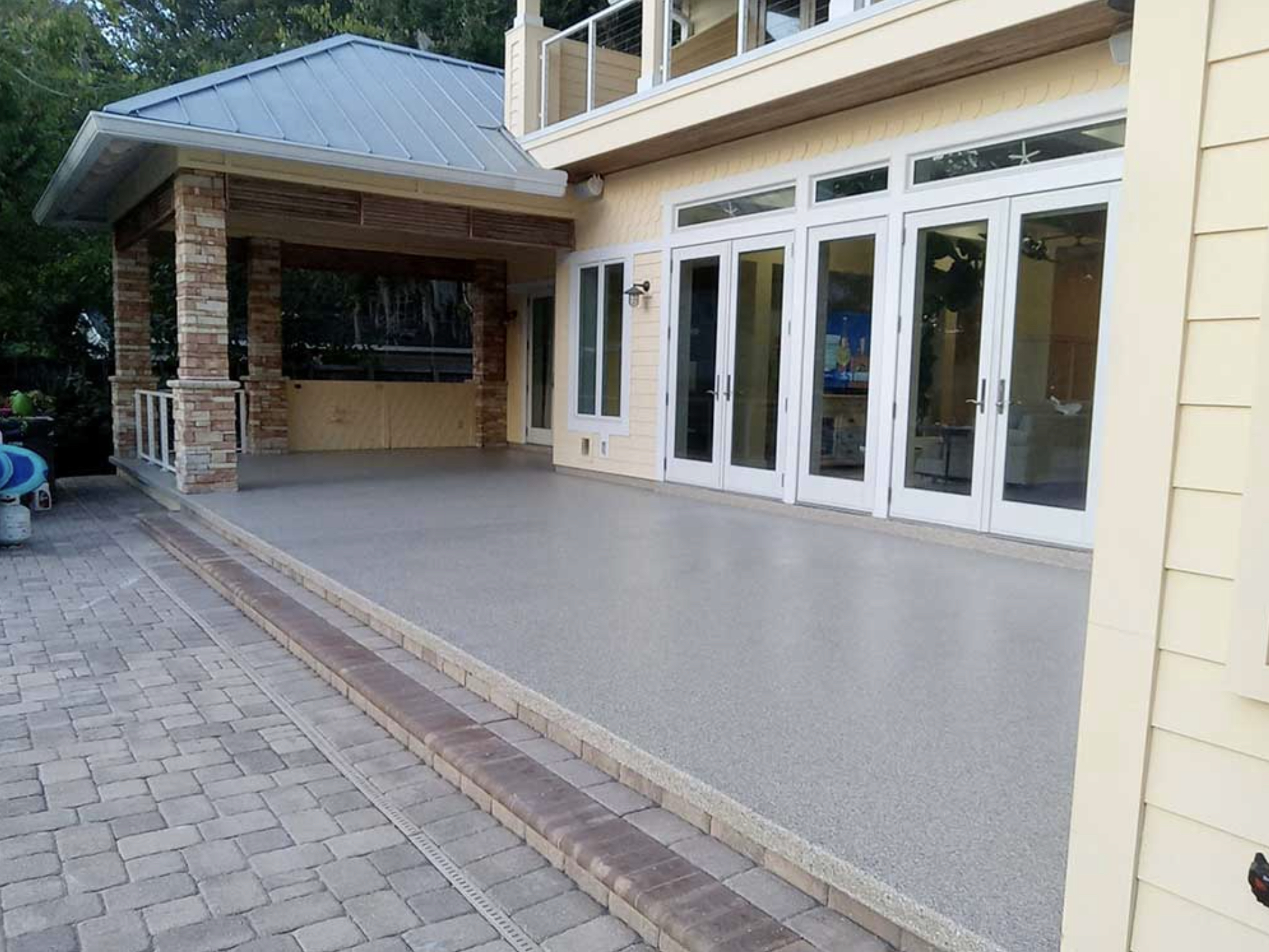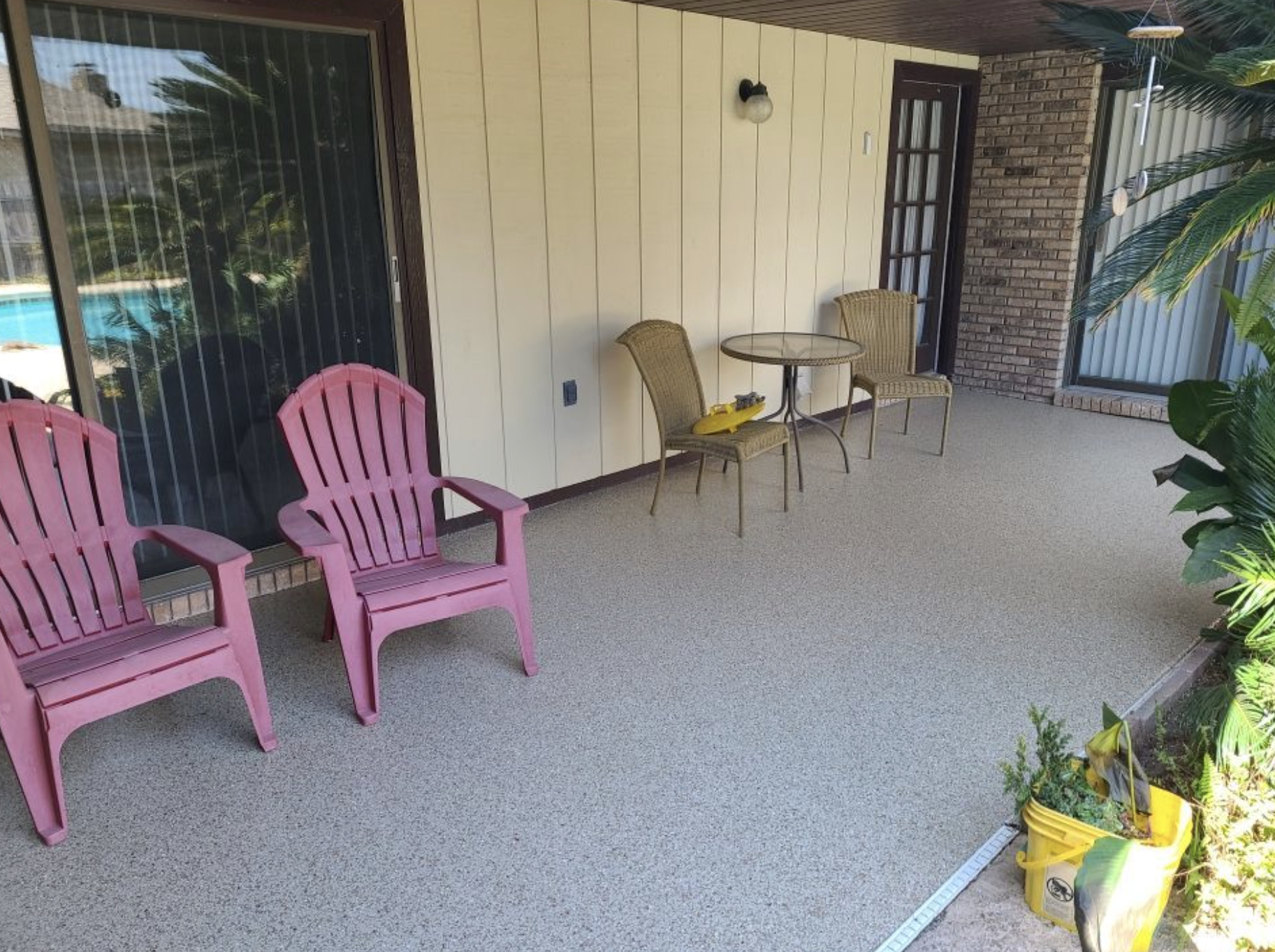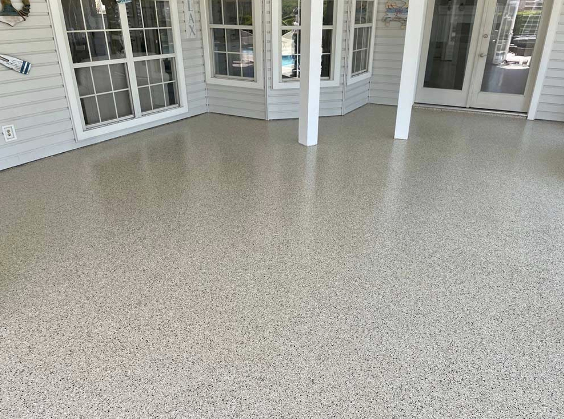 A three layer system consisting of either an epoxy or polyaspartic base, flakes and polyaspartic top-coat are applied.