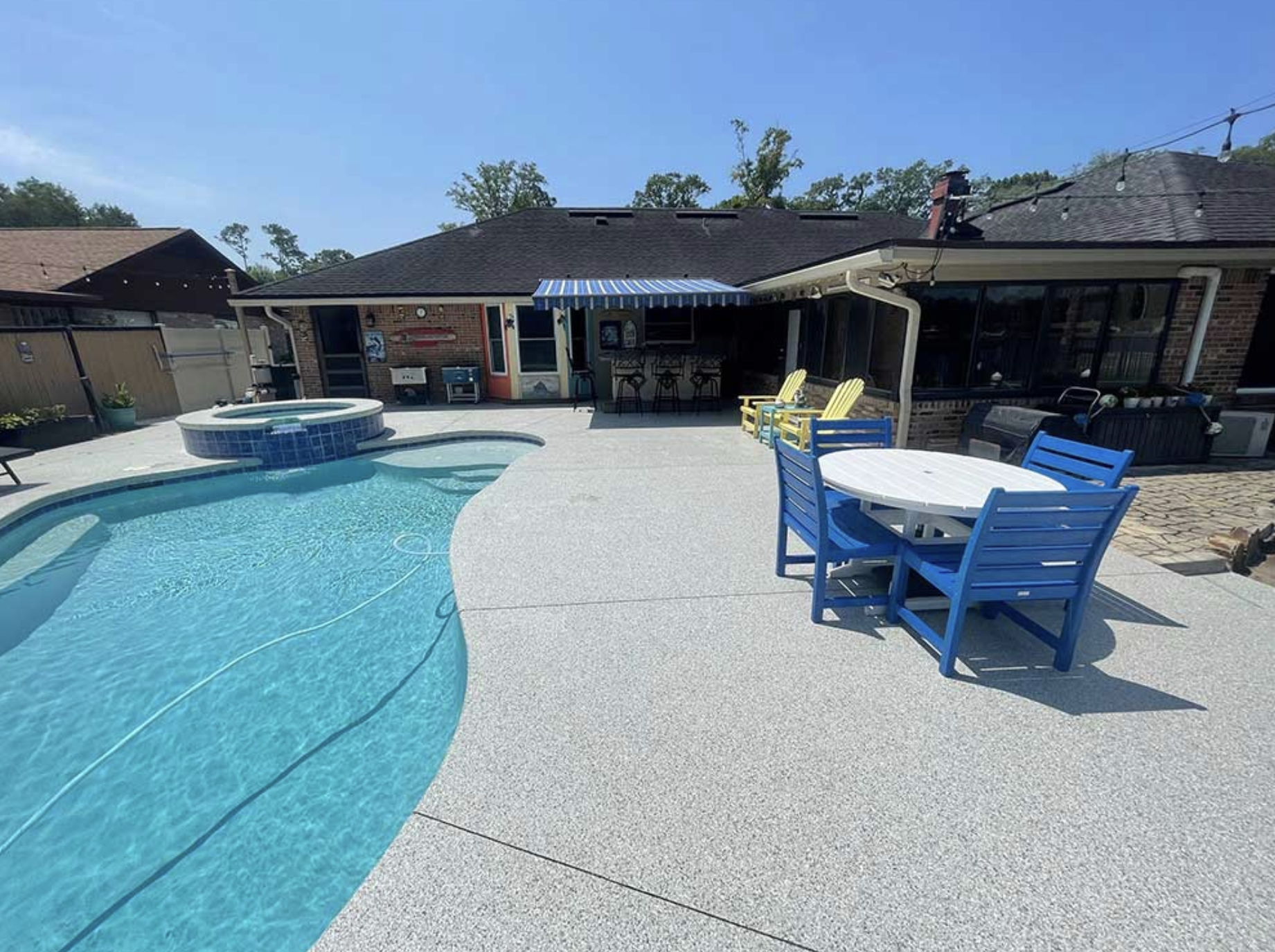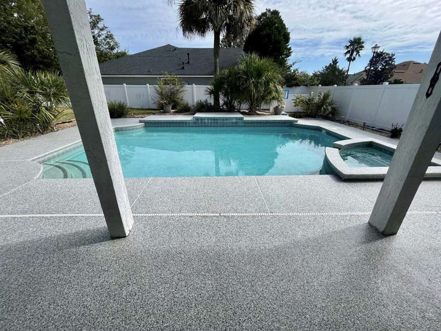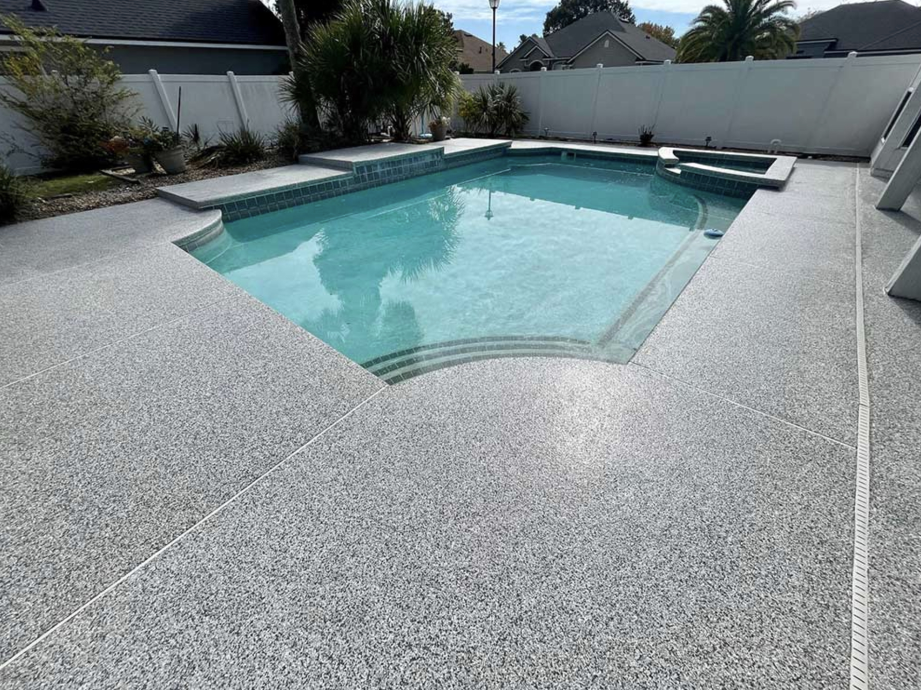 A three layer system consisting of either an epoxy or polyaspartic base, flakes and polyaspartic top-coat are applied.
